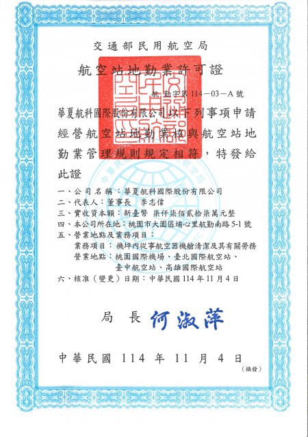 營業項目:航空站地勤業、建築物清潔服務業、病媒防治業、人力派遣業、其它修護業、園藝服務業、廢棄物清除業、小客車租賃業