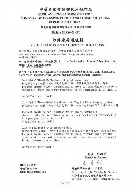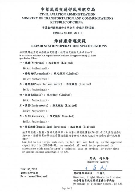 1989年成立航空貨櫃維修廠,並於2004取得認證 從事航空用貨櫃、貨盤、貨網、及餐車等修護作業
