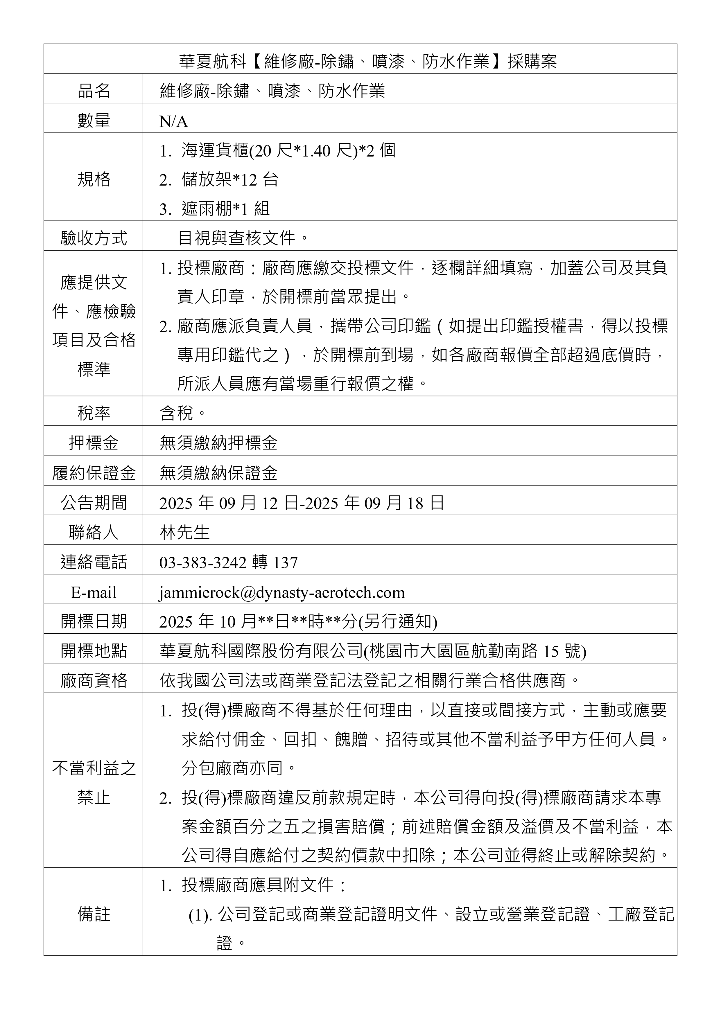 華夏航科【維修廠-除鏽、噴漆、防水作業】 2025年9月12日/在: 採購專區(一般) /通過: necos /wp-content/uploads/2017/11/20171114-L-1.png 0 0 necos /wp-content/uploads/2017/11/20171114-L-1.png necos2025-09-12 09:44:532025-09-12 09:44:53華夏航科【維修廠-除鏽、噴漆、防水作業】